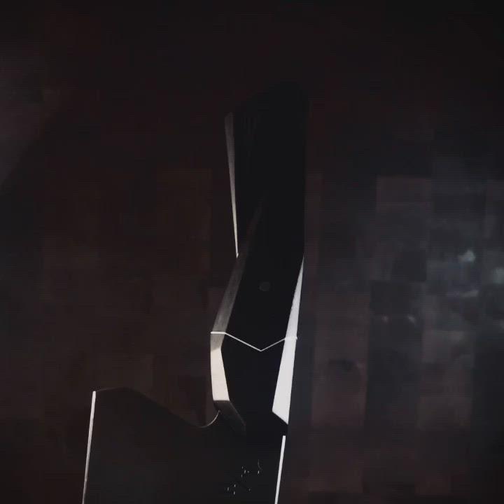 The handle faceting and profile of this knife are inspired by the lines of stealth and fighter aircraft. The piece of shiny aluminum and the handle pin, made from an aircraft drill bit, also speak to common materials and tools used in aerospace production. The dark grey blade patina and African Blackwood handle draw from the colors commonly seen on these aircraft as well.